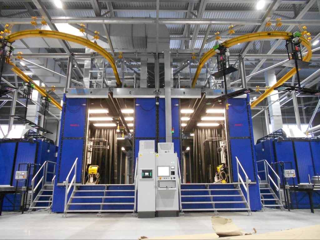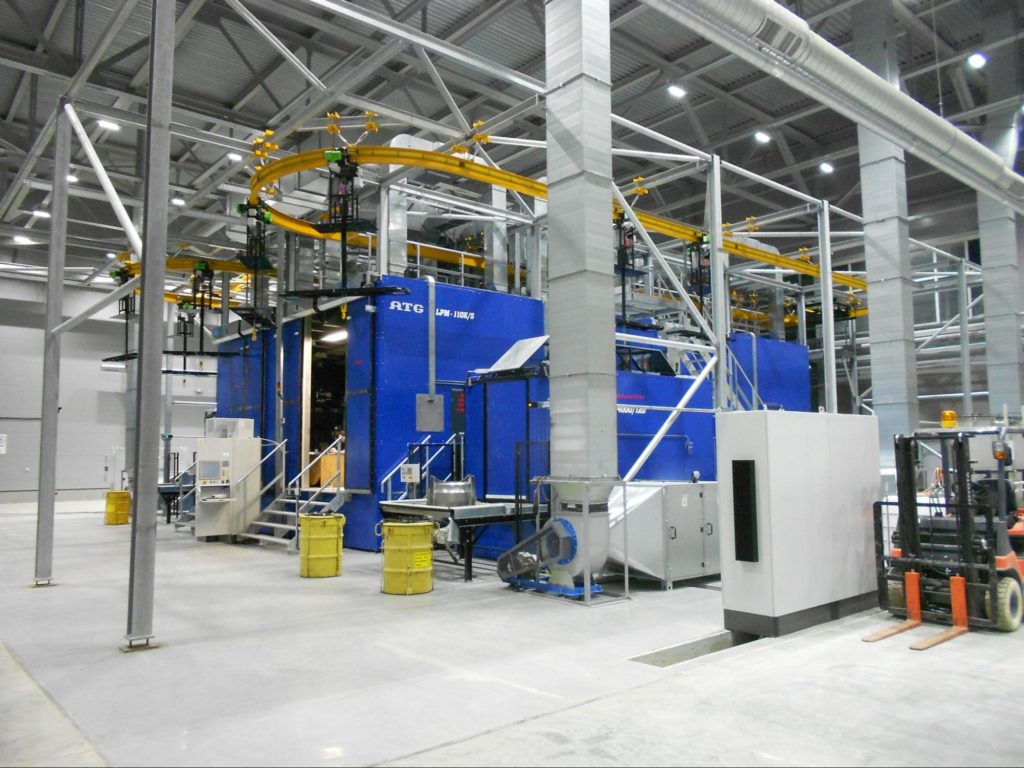 Veľké diely sú presúvané silným vrchným kladkostrojom na oválnej koľaji, linka môže zahŕňať filtráciu vzduchu, čističku odpadových vôd a iné.