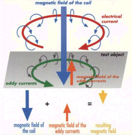 Snímač – sonda je obvykle zložený z dvoch cievkových systémov – budiaceho a snímacieho. Budiacou (primárnou) cievkou prechádza el. prúd s vysokou frekvenciou (používané frekvencie sa pohybujú v rádoch kHz až MHz). V okolí budiacej cievky vzniká striedavé magnetické pole (primárne), ktoré vyvolá v skúšanom materiáli tok tzv. vírivých prúdov. Tieto vírivé prúdy vyvolajú vznik tzv. sekundárneho magnetického poľa, ktoré je orientované proti mag. poľu primárnemu. Magnetické pole fyzikálne vyvolané striedavým prúdom v budiacej cievke i magnetické pole spôsobené vírivými prúdmi v testovanom dielci pôsobí na merací cievkový systém, v ktorom sa indukuje el. napätie. Pokiaľ sa zmenia vlastnosti skúšaného predmetu (zmena materiálu, výskyt vady atd.), alebo sa zmení vzdialenosť snímača od skúšaného povrchu, zmení sa i napätie v meracom cievkovom systéme (zmena impedancie cievky). Táto zmena predstavuje indikáciu, ktorá je ďalej spracovávaná, vyhodnocovaná a samozrejme zobrazovaná na obrazovke .