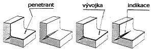 Na pripravený (očistený, odmastnený a vysušený) skúšaný povrch testovaného dielu sa nanesie kvapalina vhodných vlastností – penetrant. Po určitú dobu sa ponechá tento penetrant pôsobiť – vniká do prípadných necelistvostí. Po skončení penetračného času sa prebytok penetrantu zo skúšaného povrchu odstráni a nanesie sa tzv. vývojka. Vývojka pôsobí ako absorbent (“pijak”), nasáva penetrant, ktorý vnikol do necelistvostí a zároveň vytvára kontrastné pozadie. Pri následnej inšpekcii/hodnotení sú posudzované dvojrozmerné indikácie zistených necelistvostí. Táto metóda umožňuje zistiť – detekovať povrchové vady, ktoré sú ľudským zrakom neviditeľné. Indikácie sa hodnotia na základe vizuálneho vnemu farebného alebo jasového kontrastu. Detekčná schopnosť metódy začína pri šírke vady v jednotkách tisícin milimetra (v závislosti na drsnosti povrchu, druhu prítomných vád, použitej citlivosti skúšobného procesu apod).